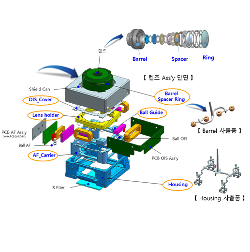 현재와 미래의 필수 제품인 스마트폰, 자동차용 카메라의 핵심부품인 Actuator와 렌즈의 정밀 사출물을 품질 최우선, 고객의 신뢰 구축을 통하여 다년간 축적된 기술로 차별화를 준비하고 시장을 선도할 수 있는 기업으로 성장하고 있습니다.